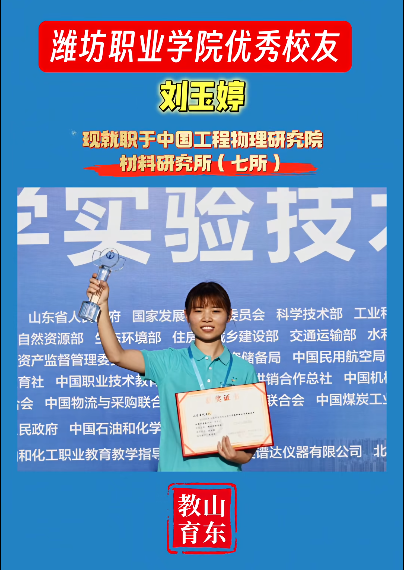 刘玉婷,2019级分析检验技术专业员工,中共党员,山东省优秀毕业生,国家奖学金获得者,2022年获山东省职业院校技能大赛(高职组)化学实验技术赛项个人一等奖,同年获全国职业院校技能大赛(高职组)化学实验技术赛项一等奖第一名,因表现优异,被中国工程物理研究院化工材料研究所(三所)和中国工程物理研究院材料研究所(七所)同时录用,现就职于中国工程物理研究院材料研究所(七所),成为“两弹一星”精神的时代传承人。